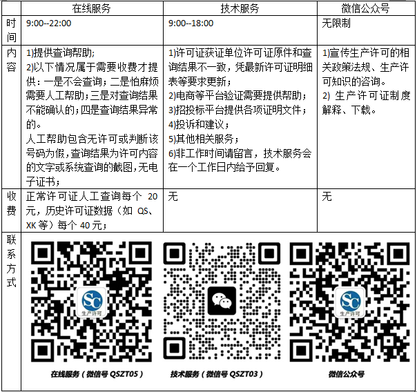 服務(wù)范圍 :提供查詢幫助和驗(yàn)證、許可證查詢異常處理、宣傳生產(chǎn)許可的相關(guān)政策法規(guī)、生產(chǎn)許可知識(shí)的咨詢。為減輕人工服務(wù)工作量,建議自助查詢;查詢時(shí)請參考查詢格式(幫助)